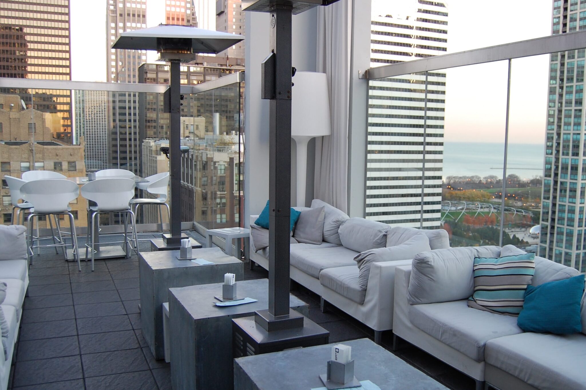 If the heaters and fire pits simply won’t keep the chill out, there’s a large indoor salon complete with huge fireplace, glass walls and swanky deep sofas to sink into to savor a ginger martini with jumbled scenes of urban landscape outside.