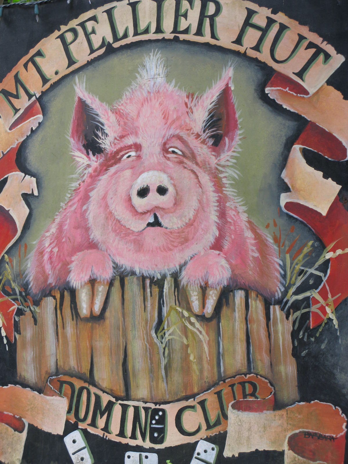 The pigs live at the Mount Pellier Domino Club which is located on a long and stunningly beautiful rustic road lined with massive Mahogany trees just north of Frederiksted. You know you’re there when you see the big wooden sign adorned with a swine guzzling a can of beer.
