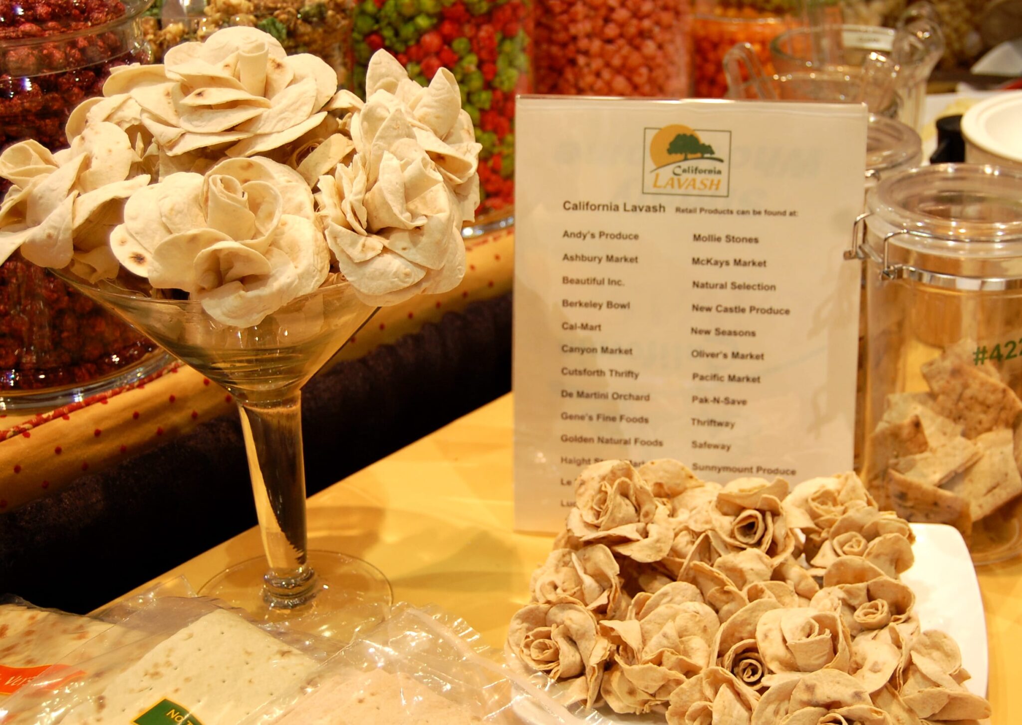 The Lavash turned into a flower arrangement caught my eye. Wrapped and tied and cut. Could be dried and saved for a long time, I was told.