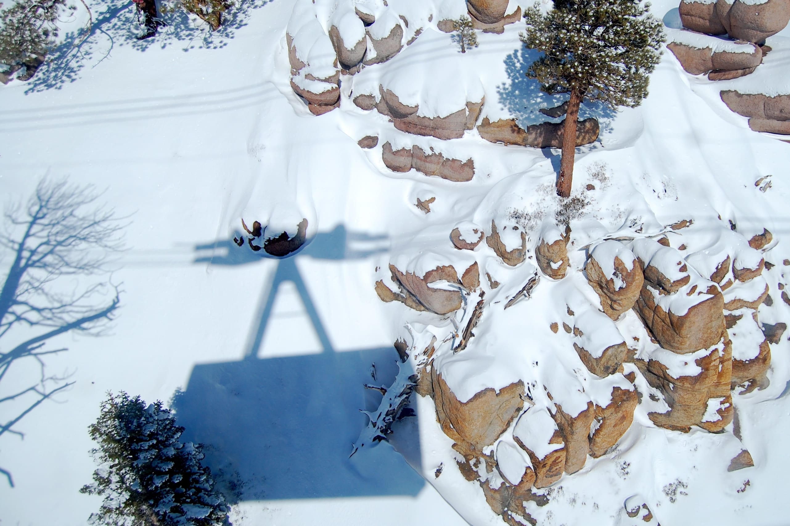 The Cable Car and it’s Shadow. Can you believe 85 skiers can crowd into this cable car with their equipment for the ride up the glorious mountain to High Camp?