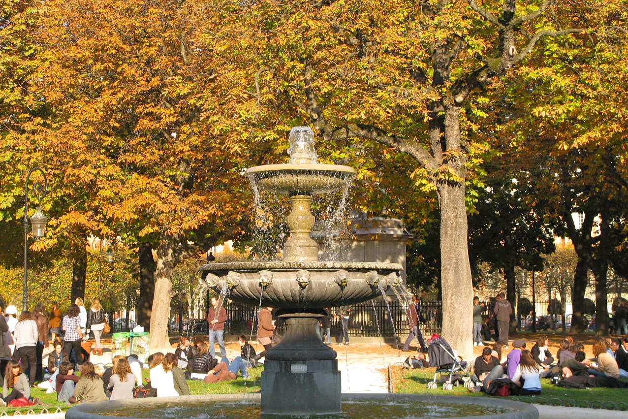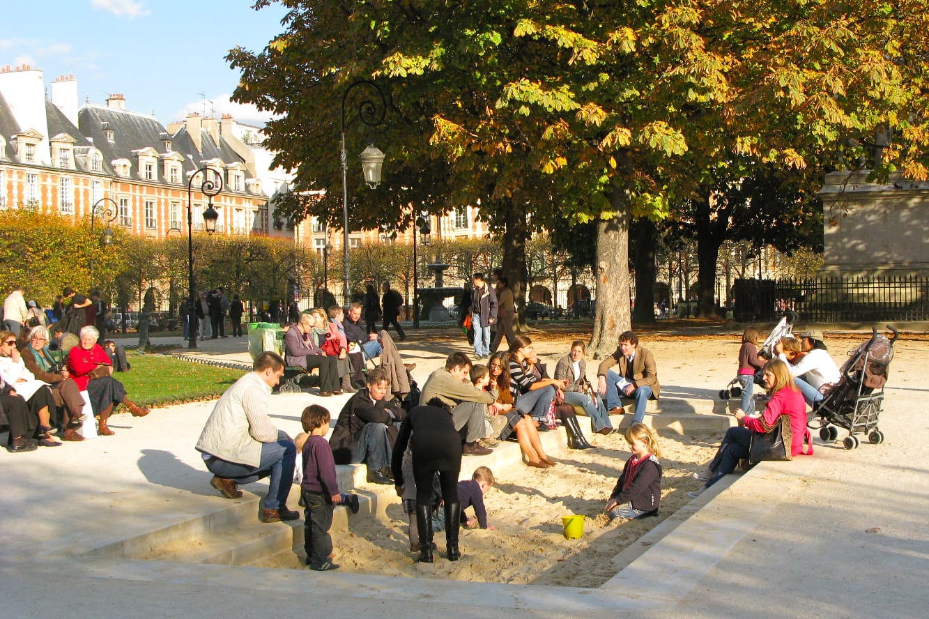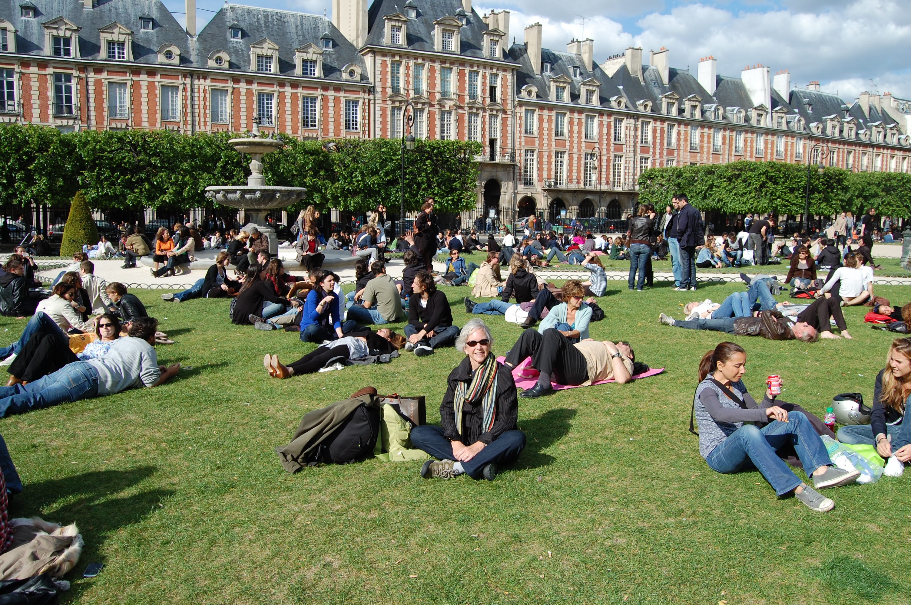 I like the youth and energy super-imposed on the historic buildings and winding streets. I love Place des Vosges– truly the most beautiful square in Paris. Once a royal palace, it is now a square where families and lovers and old folks and young folks hang out in the graceful park complete with fountain, sandboxes, benches and trees.
