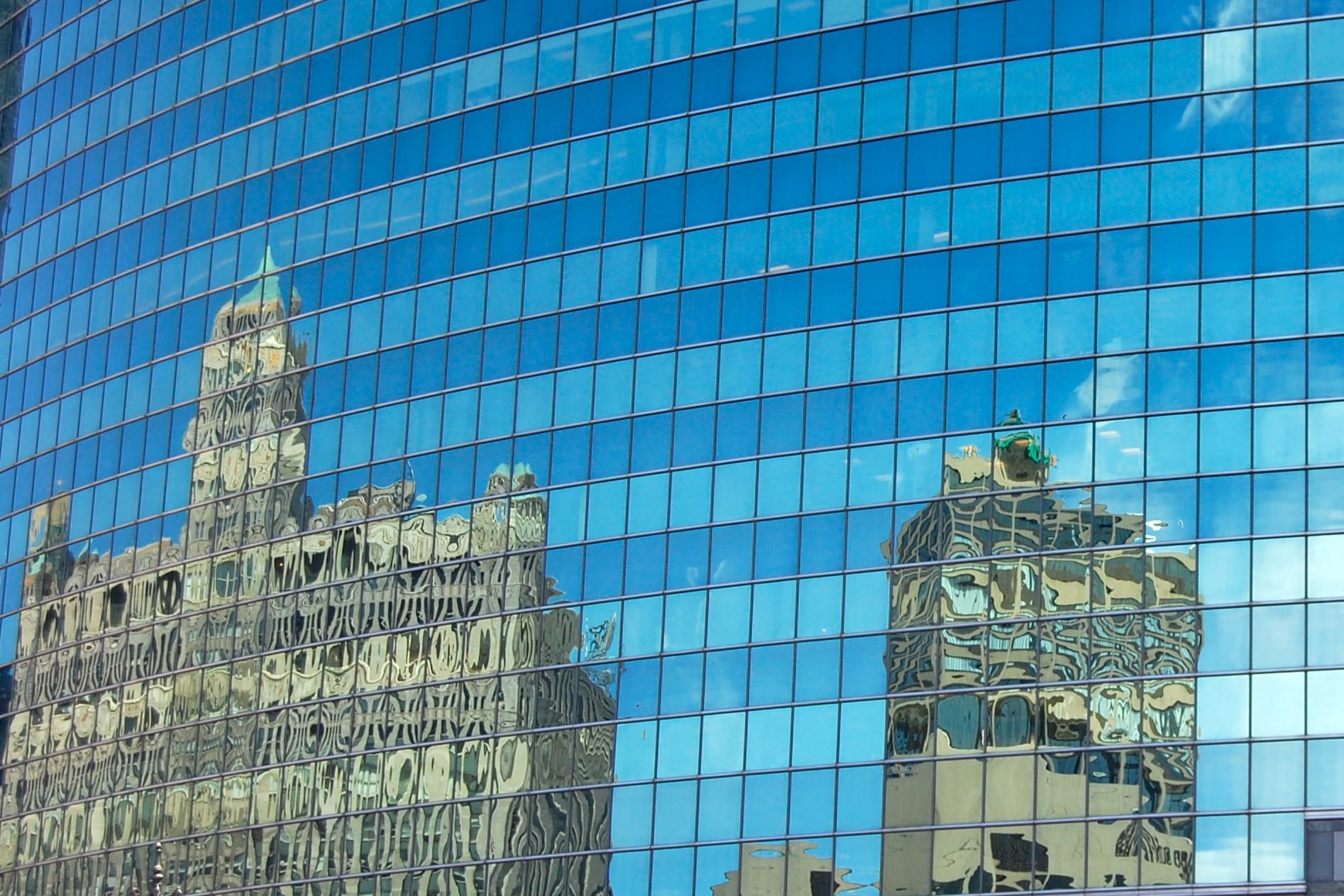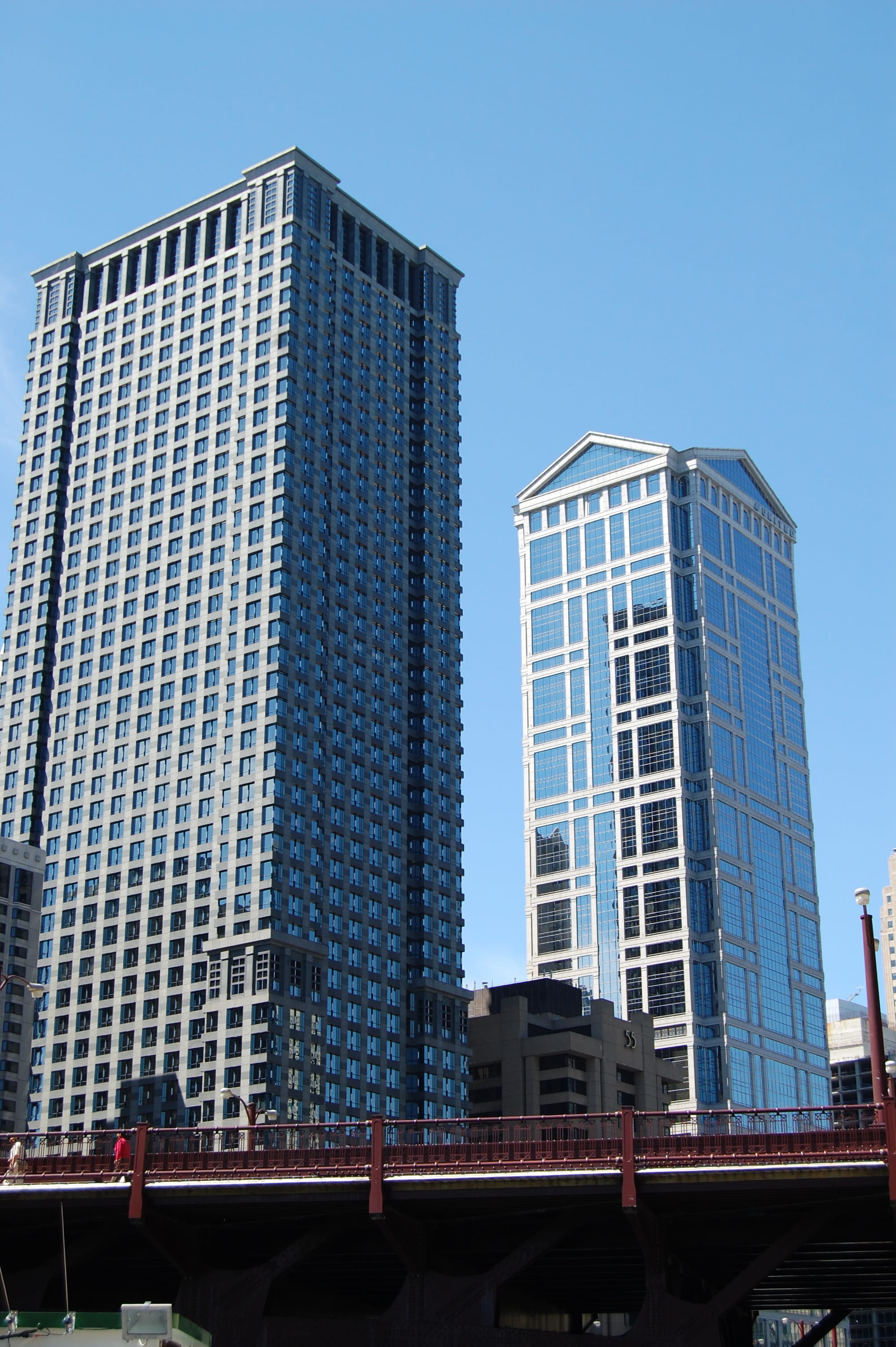 I also enjoyed seeing reflections of buildings. In this case, one can see the massive Merchandise Mart, built in the 1930s, reflected in the wonderful curved glass wall of the 333 West Wacker Drive across the river.