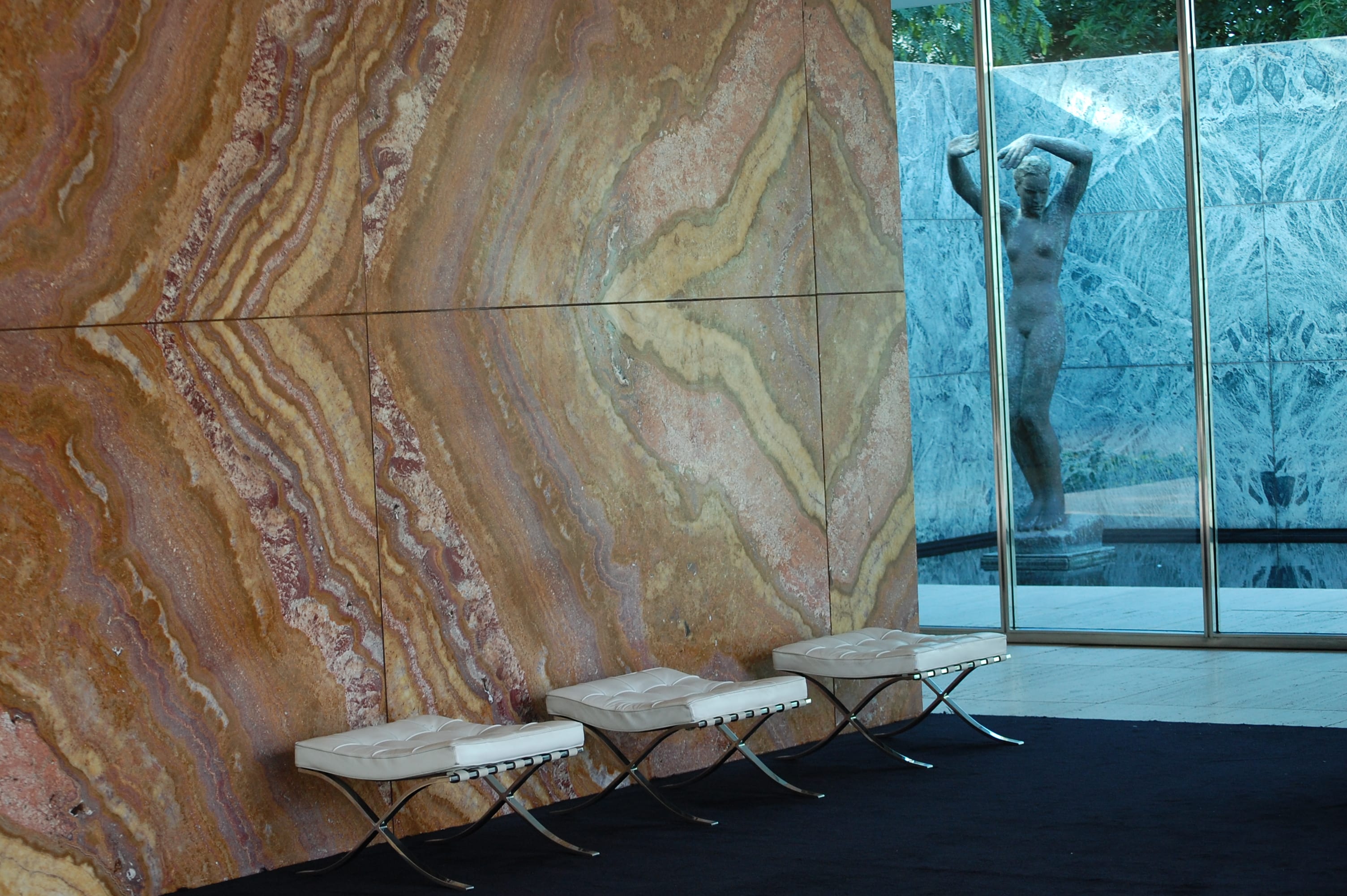 And then my favorite: the Mies van der Rohe Pavilion. Built in 1929 for a Barcelona International Exposition, it is a stunning example of the work of a man known for many things but often associated with the phrase, “Less is More.” It is a marvelous contrast to all the curves and ornamentation of Gaudi’s work and a real treat if you like this kind of thing. I do.