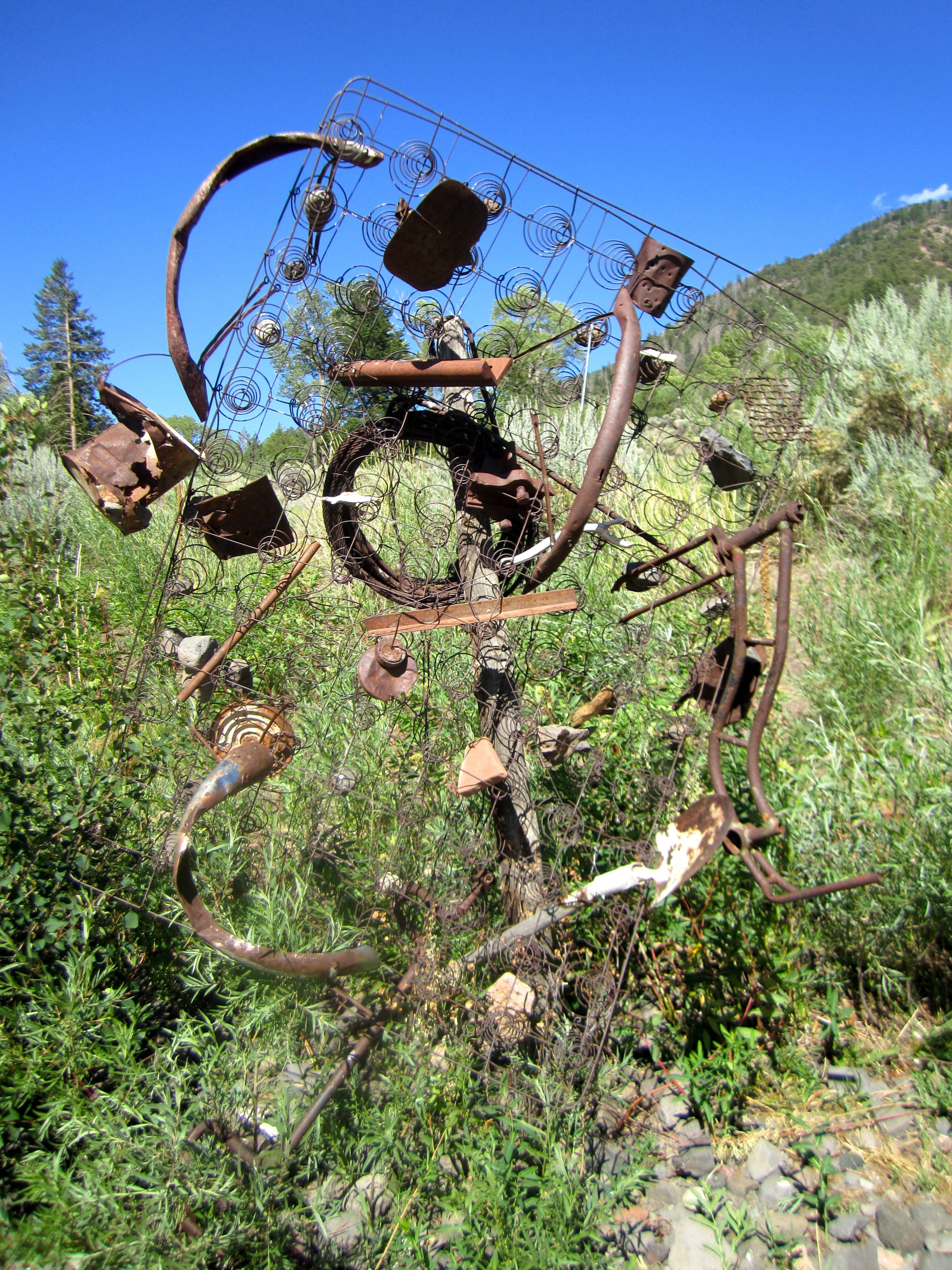 I found the focus on art especially appealing. It appeared in all kinds of forms in a variety of materials and when you least expected it. For example, look at this sculpture created from “found material” on the bank of the Colorado River where we stopped for a granola bar and drink of water.