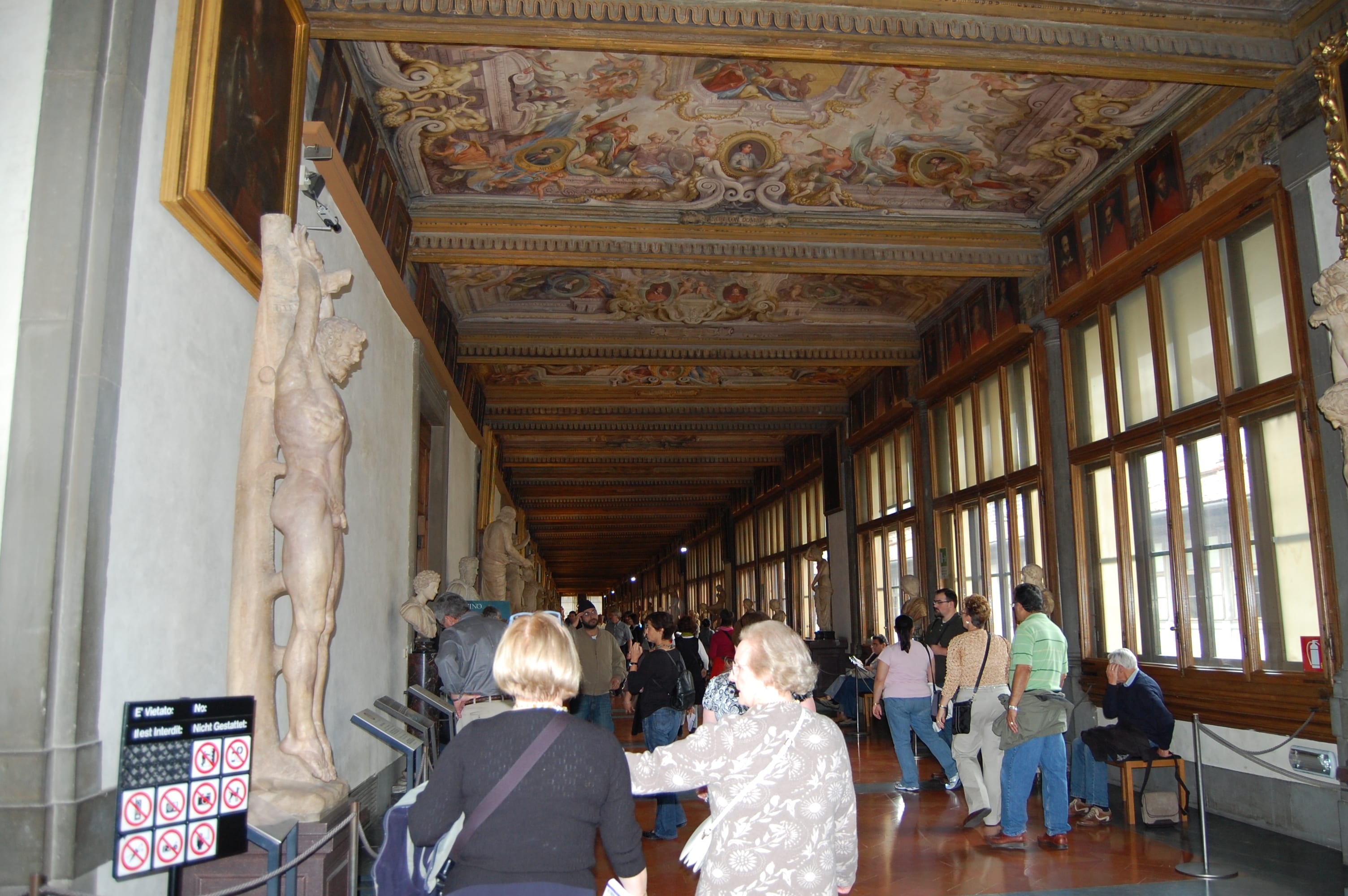 I loved the gorgeous ceiling in the Uffizi and the spectacular view of the bridges of Florence from the third floor gallery. The tiny shops on the Ponte Vecchio, now housing gold merchants, were butcher shops until the mid 1500s. Can you imagine the smell? Eewww.