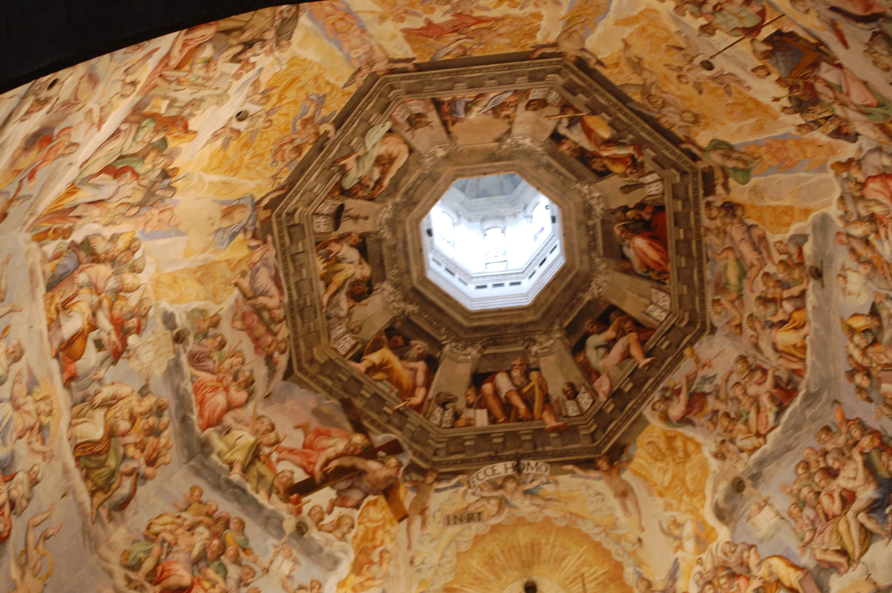 After that we popped into the Duomo. Being rather tired, I almost skipped this but was glad I didn’t. While only slightly larger than the huge catheral in Siena, it is very different. Siena is ornate and striped in gray and white marble. Dark. The huge Catheral in Florence(fourth largest in world) is almost stark in contrast. It features an absolutely stunning dome ceiling.