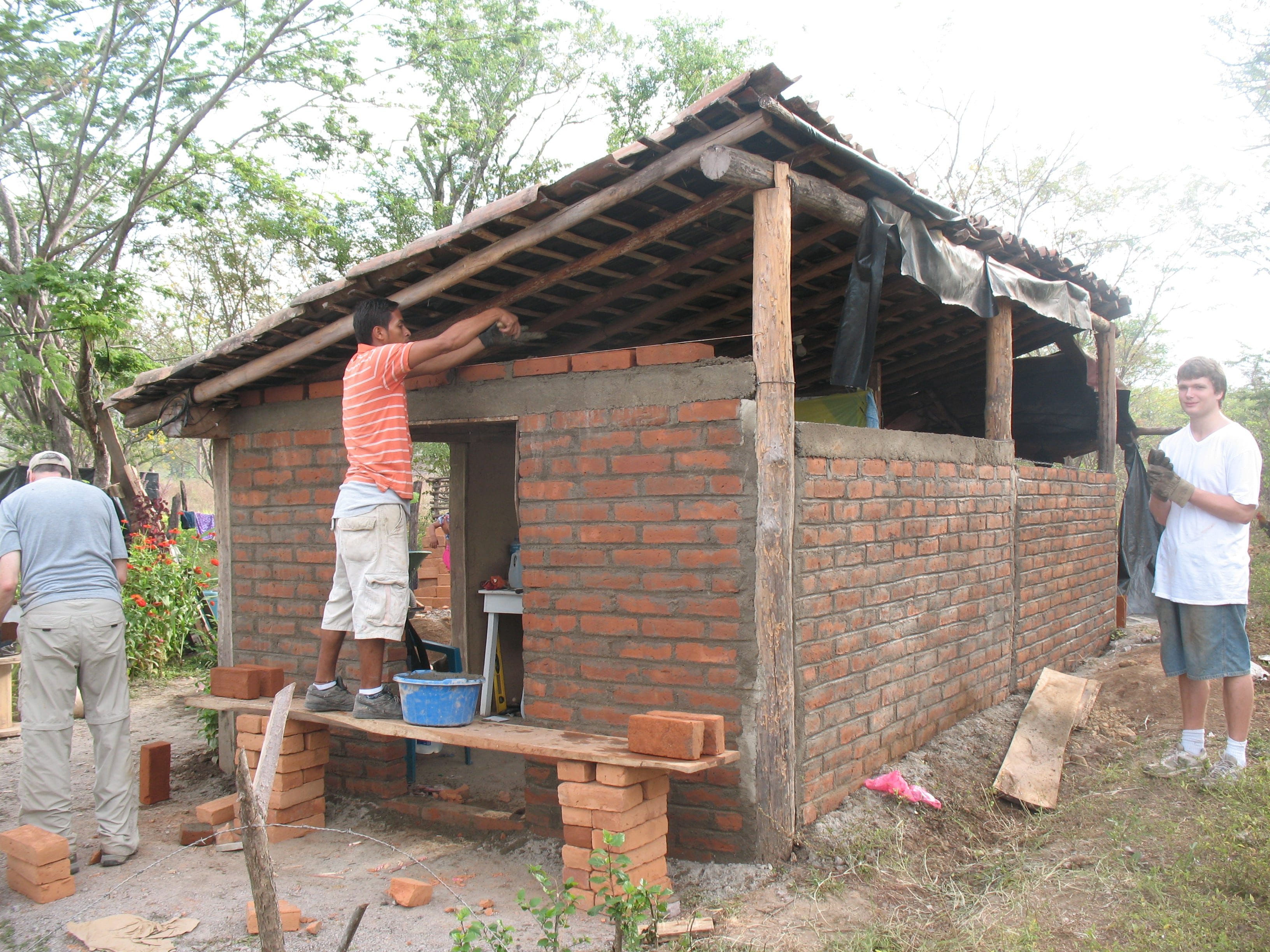 The work isn’t terribly profound: demolish the shaky wall, dig a trench, line it with river rock. Fill the trench seven inches below grade with mescla (mortar) off the pile on the dirt floor where it has been mixed to the right consistency. Grab a brick, wet from soaking. Position it, fill the gaps with the trowel, do it again. And again and again, through the sweltering day.