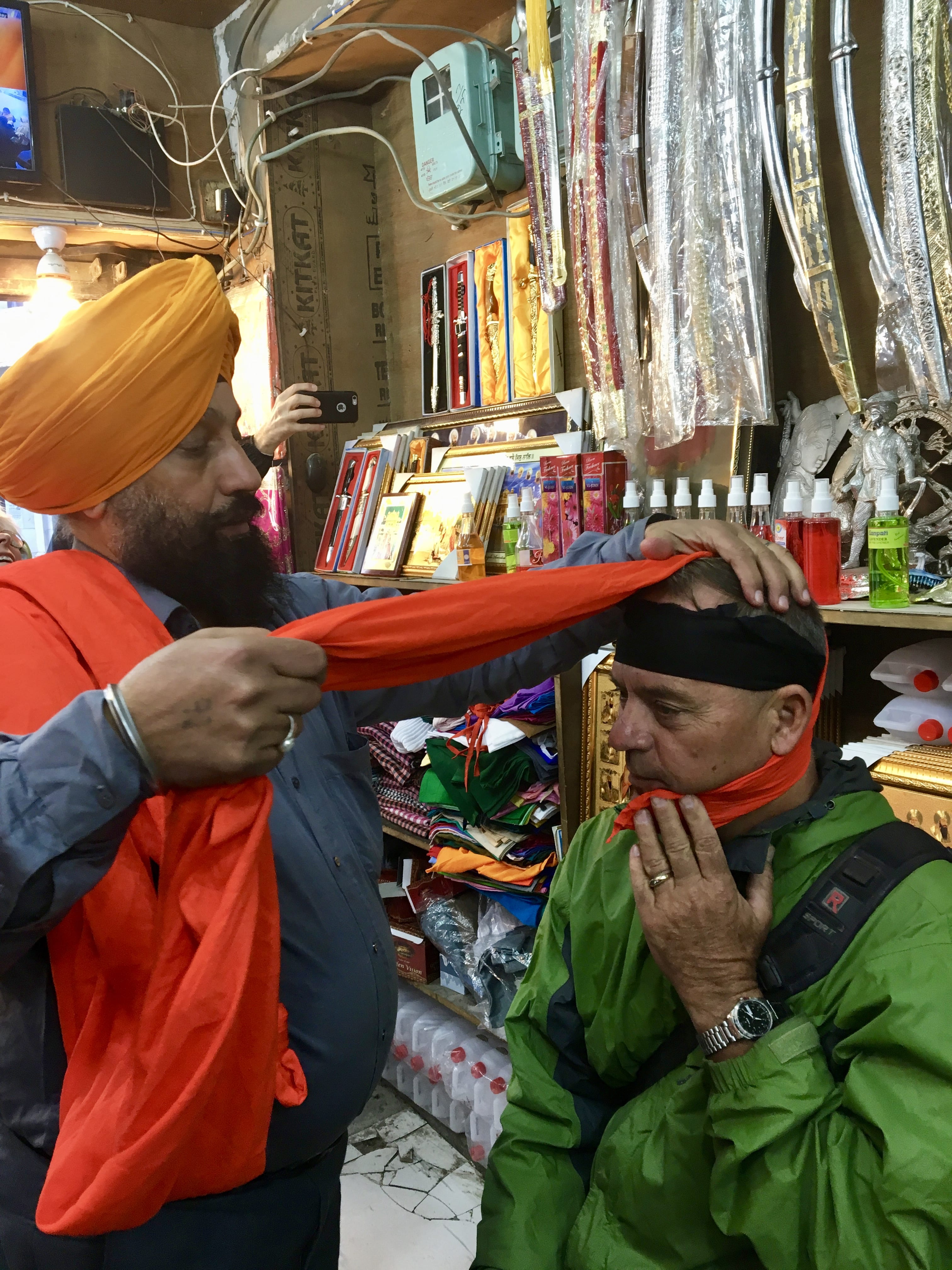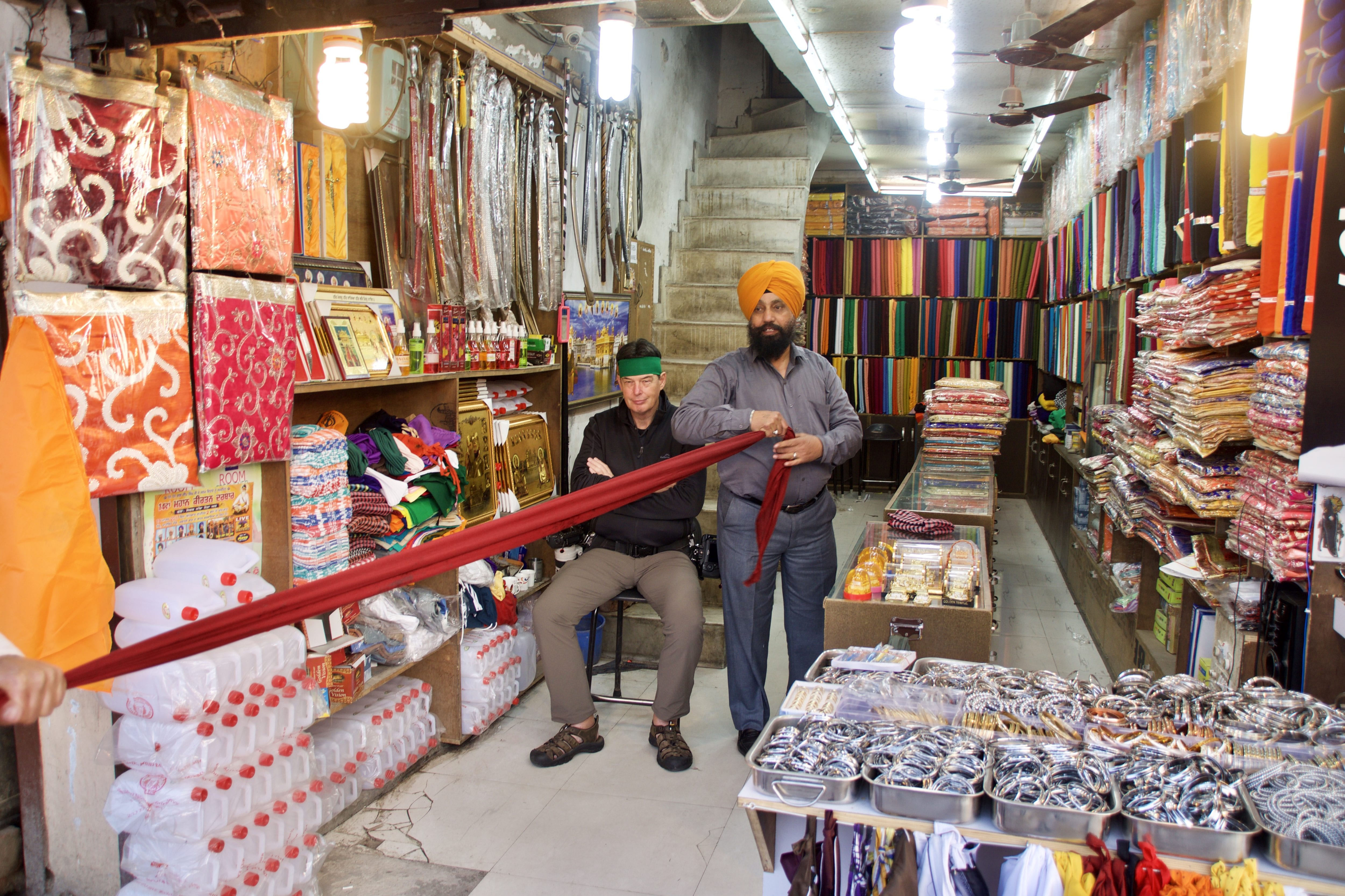 He would buy his turban at a turban shop. We visited one in Amristar before entering the Golden Temple. Since head coverings are a sign of respect some of the men in our group bought turbans and had them wrapped. I’m sure they’ll always remember this experience.