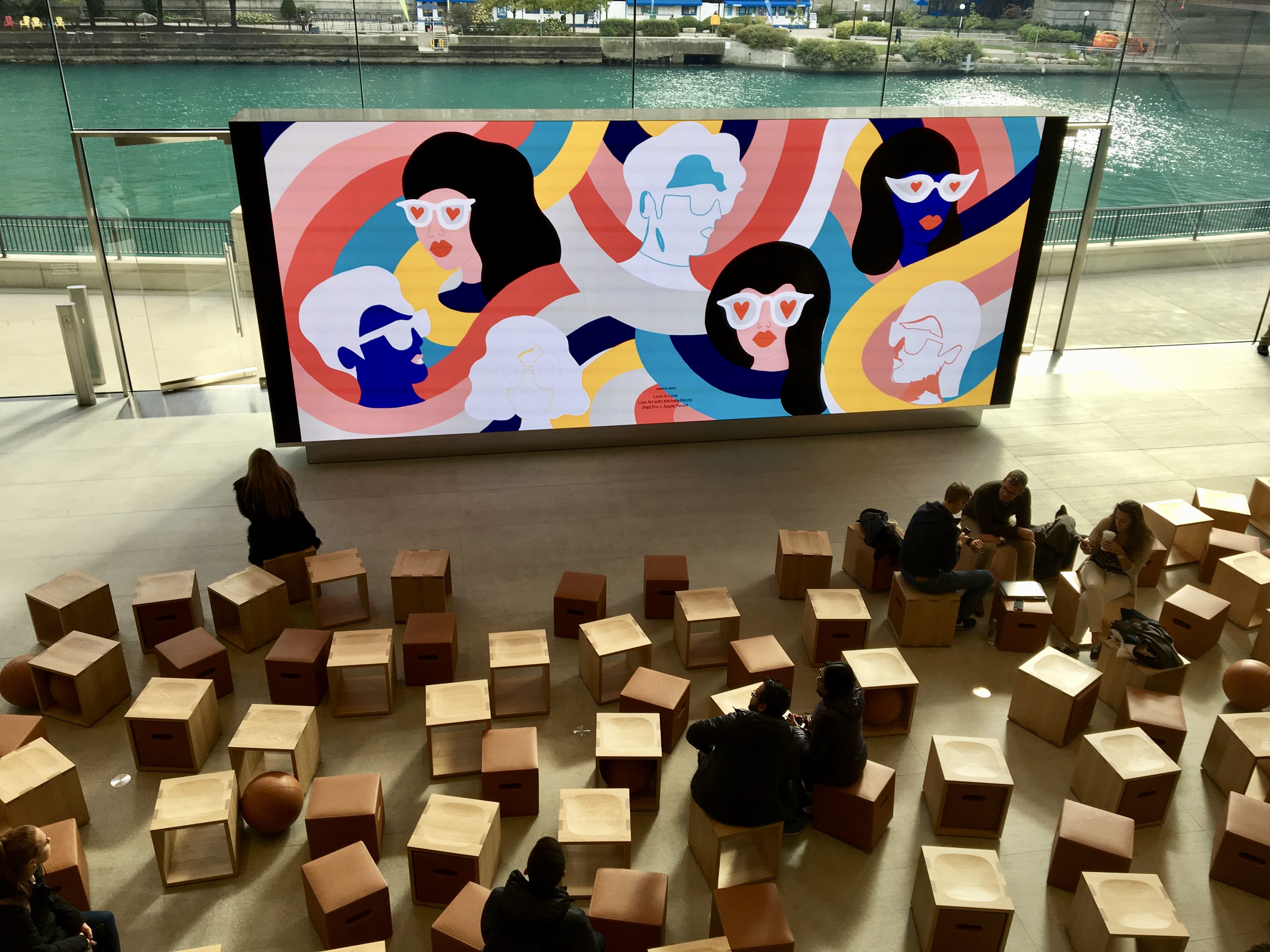 The building with its iPad shaped roof and broad terrace is nestled between the Michigan Avenue bridge and a stream of high rise buildings. What’s more interesting though is that Apple has provided seating areas for the public to just to enjoy the river view.