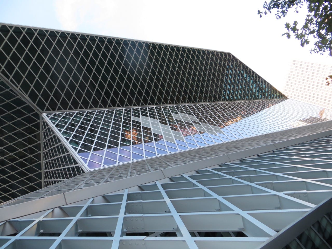 Even the downtown public library in Seattle feels like a modern day sculpture intended to be viewed from every conceivable vantage point and grounded in the heart of a bustling urban landscape. How often, when once is experiencing a big city library does one say: Well, I have to walk around the block on this one and then I have to walk around the block again.