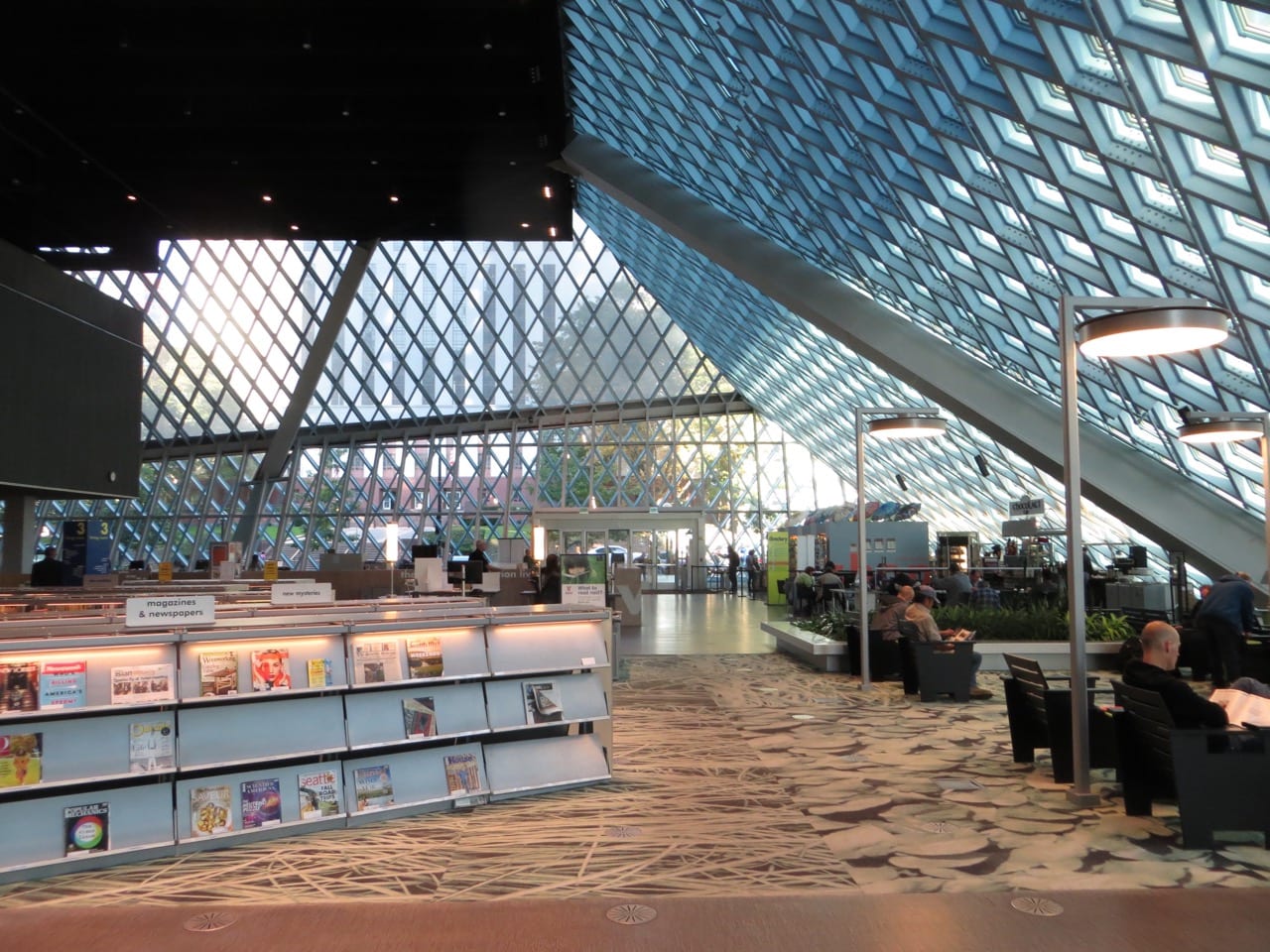 I didn’t want to miss a single point of view and then marveled at how functional this building / sculpture is for meeting all of the needs for which it was designed for the folks of Seattle. Anyone who’s been to the city could probably describe a walk that involved some huffing and puffing due to the steep hills one might have to navigate. The ‘walks’ around the library block definitely took care of our aerobic needs for the day.