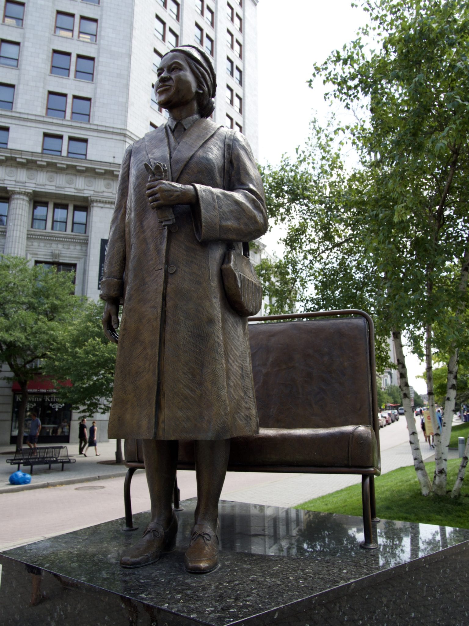 Another interesting sculpture that I have often walked by and not paid any attention to is Rosa Parks standing in front of a bus seat on Monroe kitty-corner from the Amway Grand Plaza. I think this is curious for two reasons. Rosa Parks has no connection to Grand Rapids and she’s known for sitting. Instead here she is shown in bronze refusing to give up a seat on a bus to a white man in Montgomery, Ala. in 1959