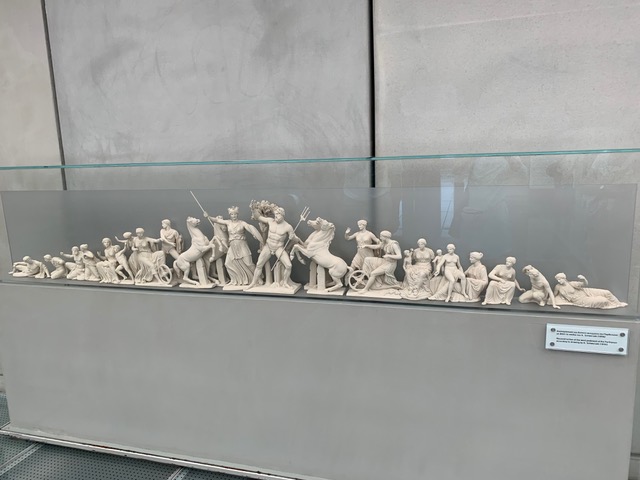 The glaring absence of the missing sculptures is is apparent in how they are displayed. The original honey colored pieces are in their correct placement and look ancient, and the missing elements are rendered in white plaster. Fully half of the sculptures are mounted not in Athens, but in the British Museum.