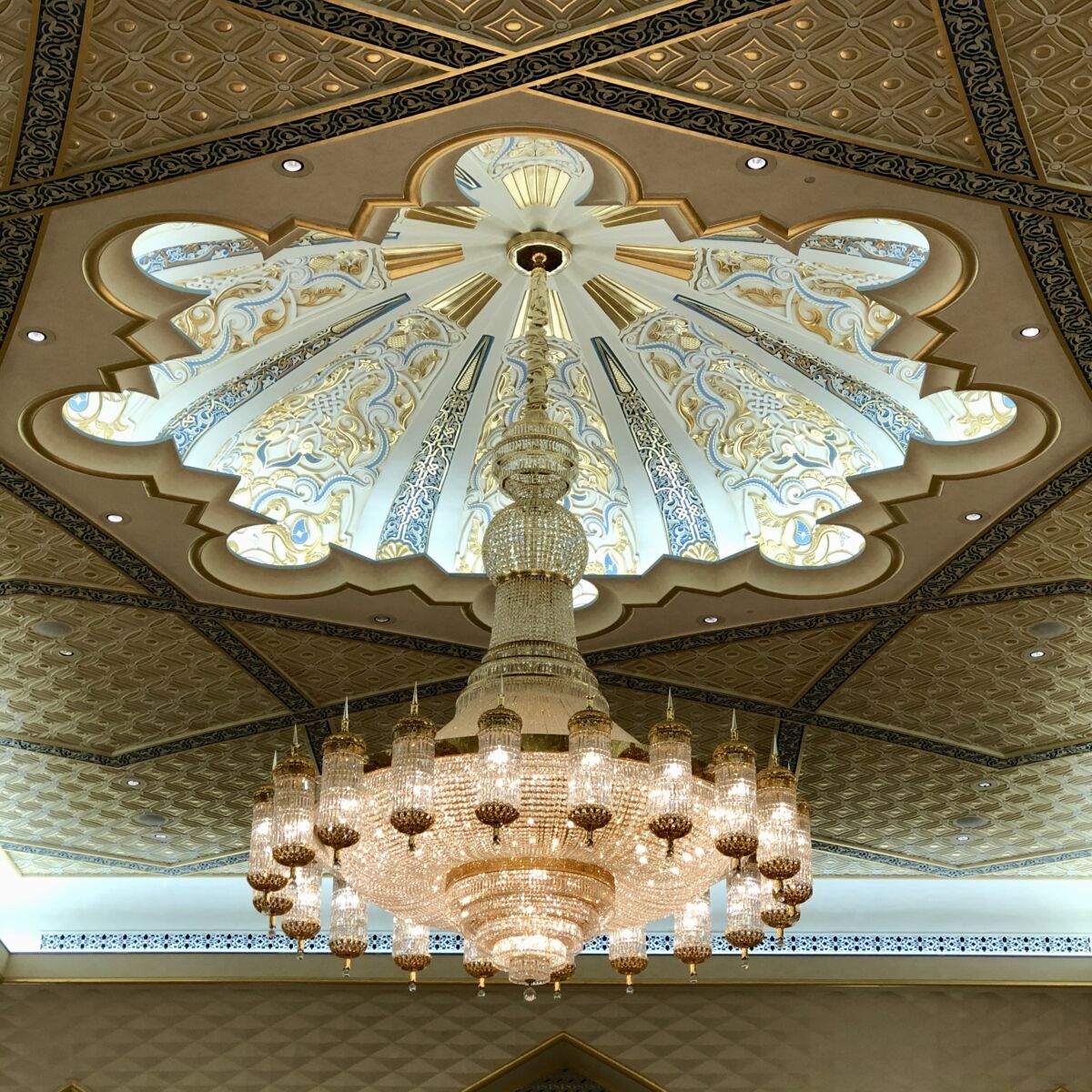 And most mosques have a dome, representing heaven. I can see why the designer would insert a gorgeous chandelier in this area. It’s also a way to bring the huge space down to a more human scale. In Christian churches you see the use of banners to accomplish this.