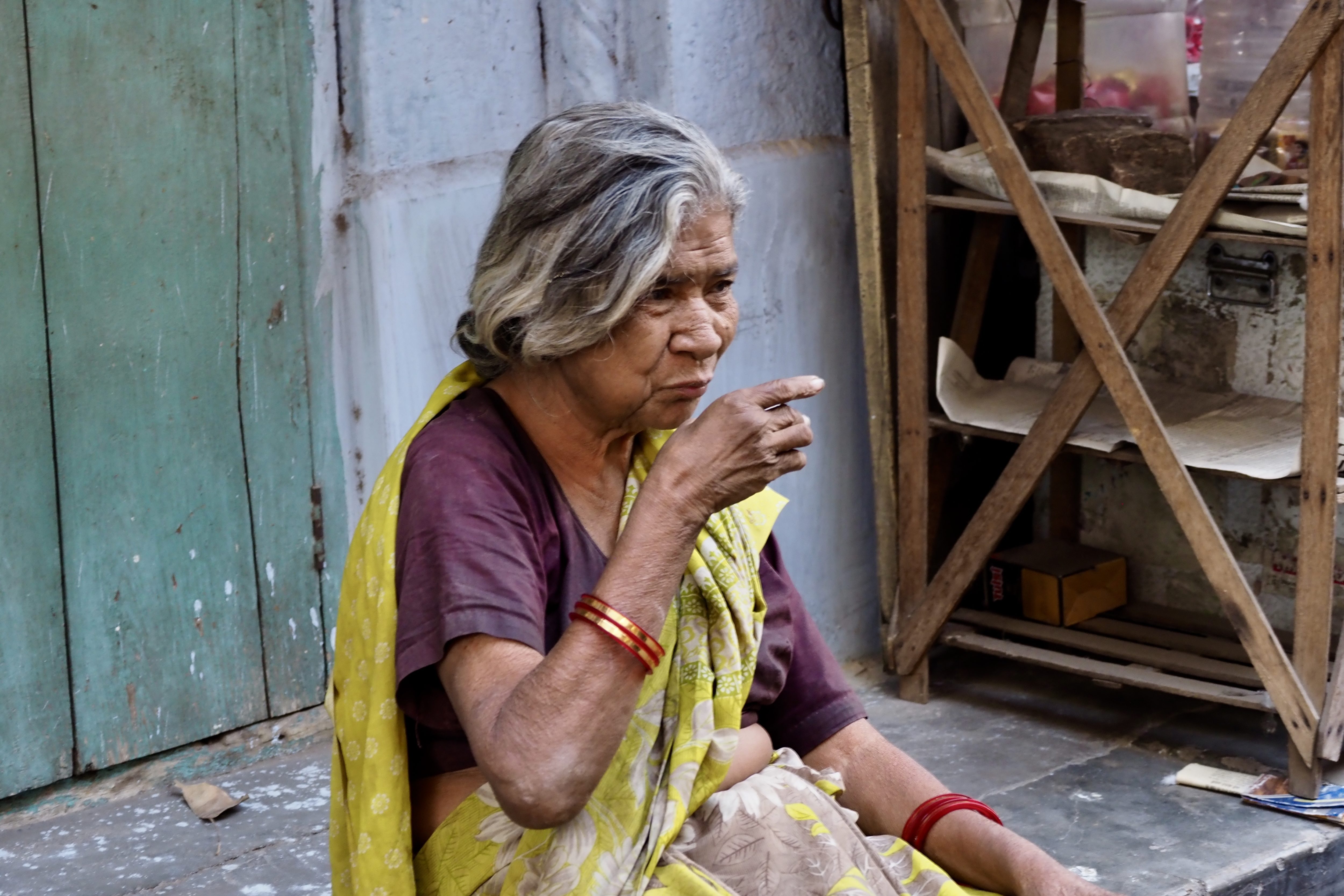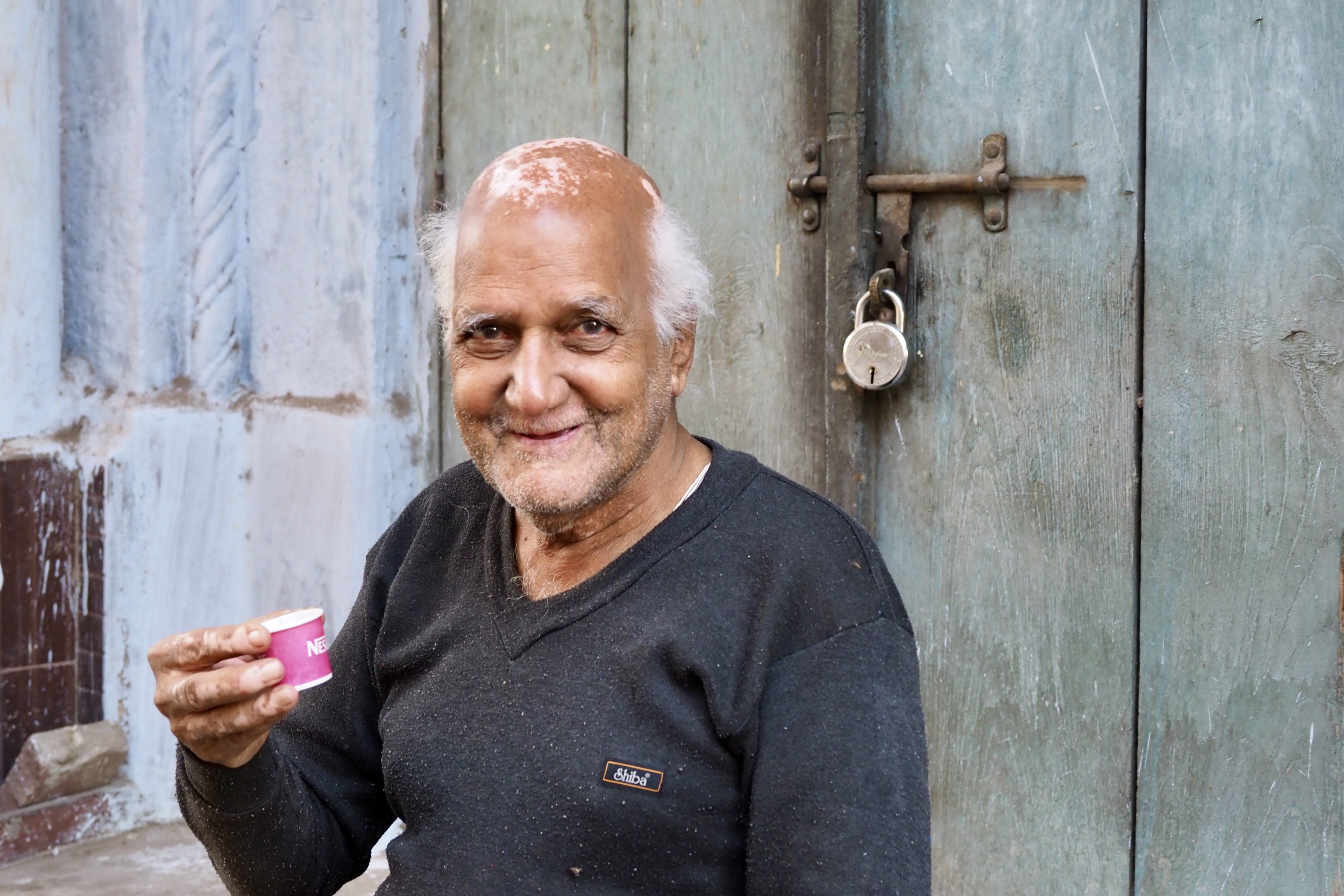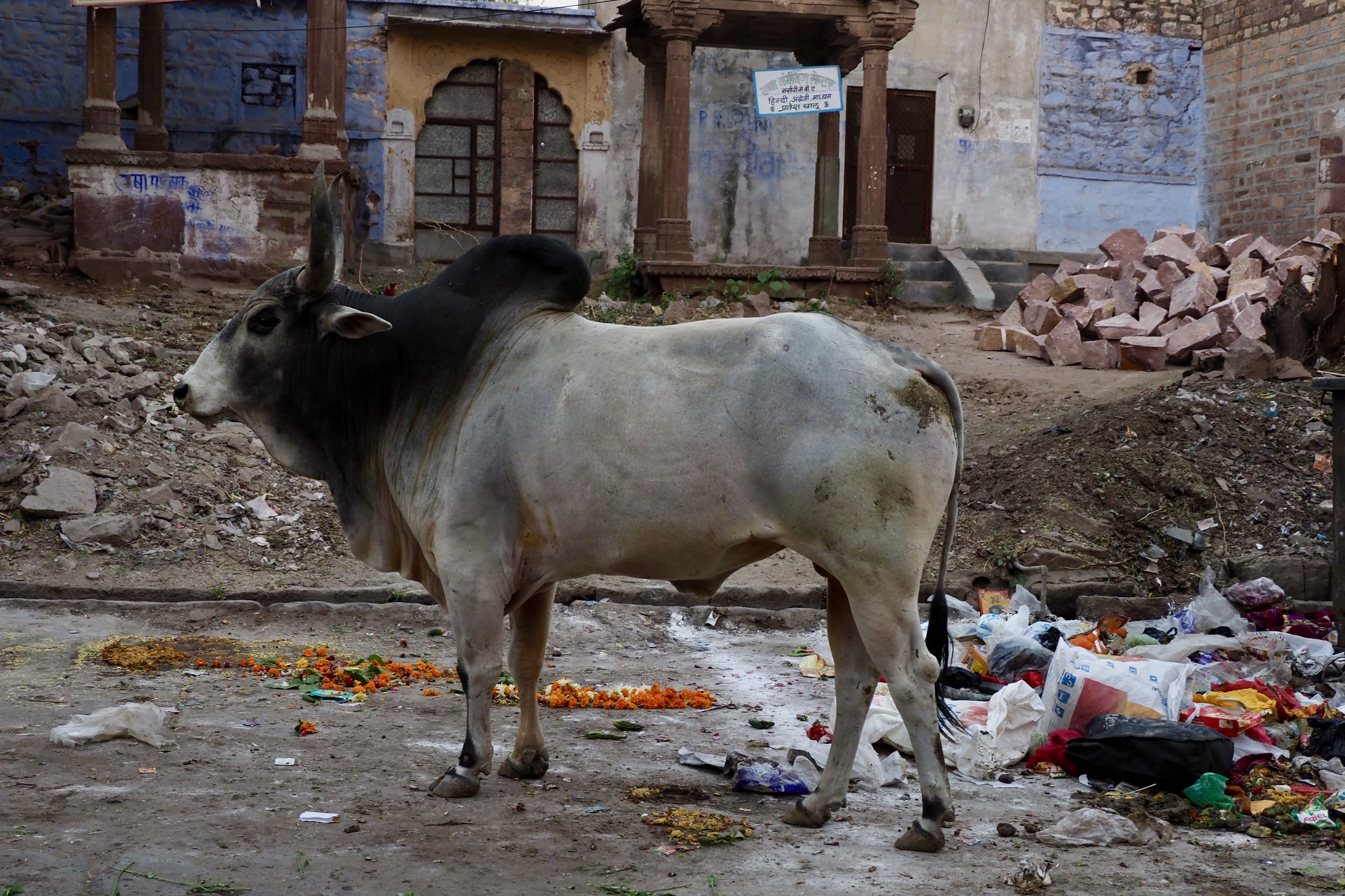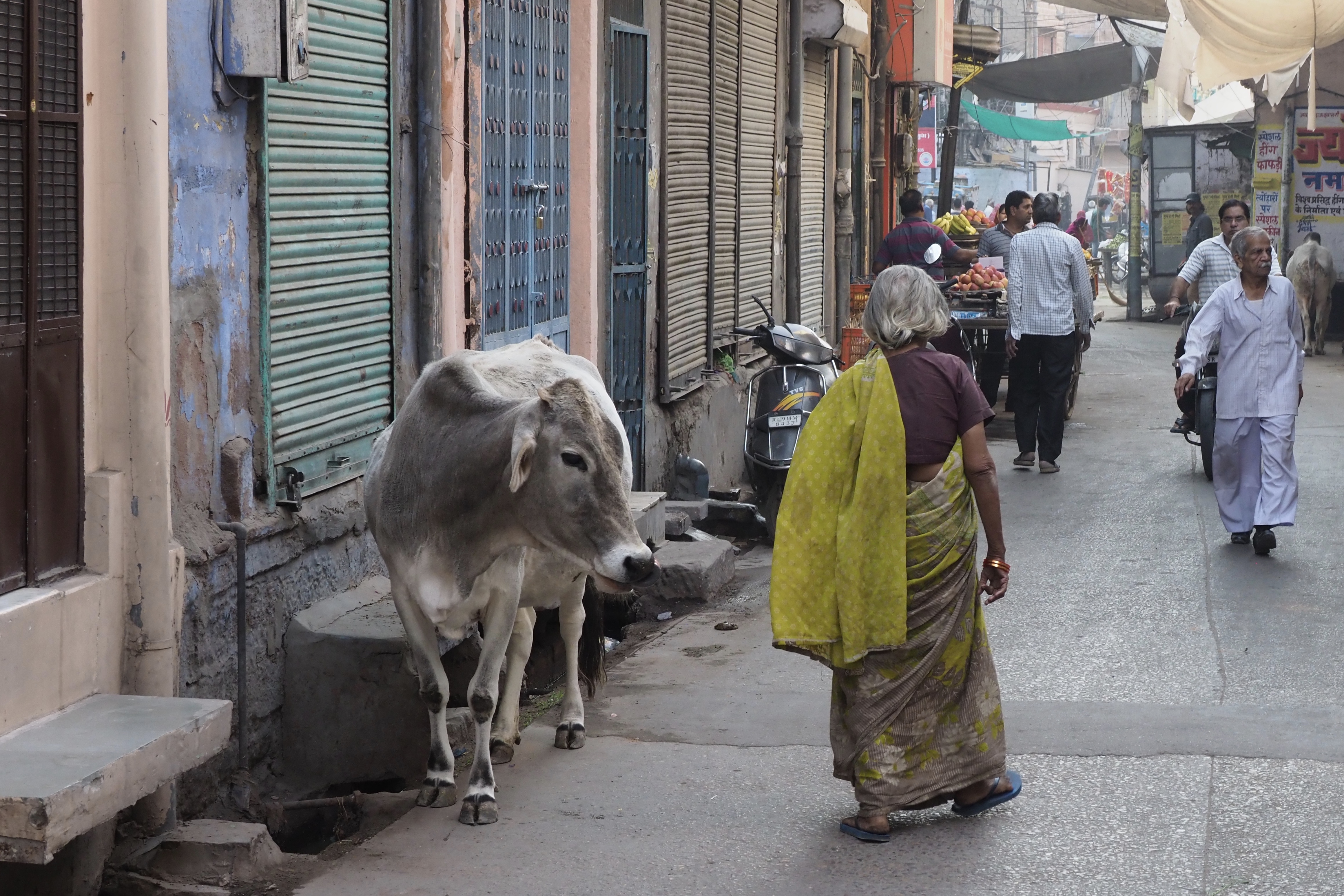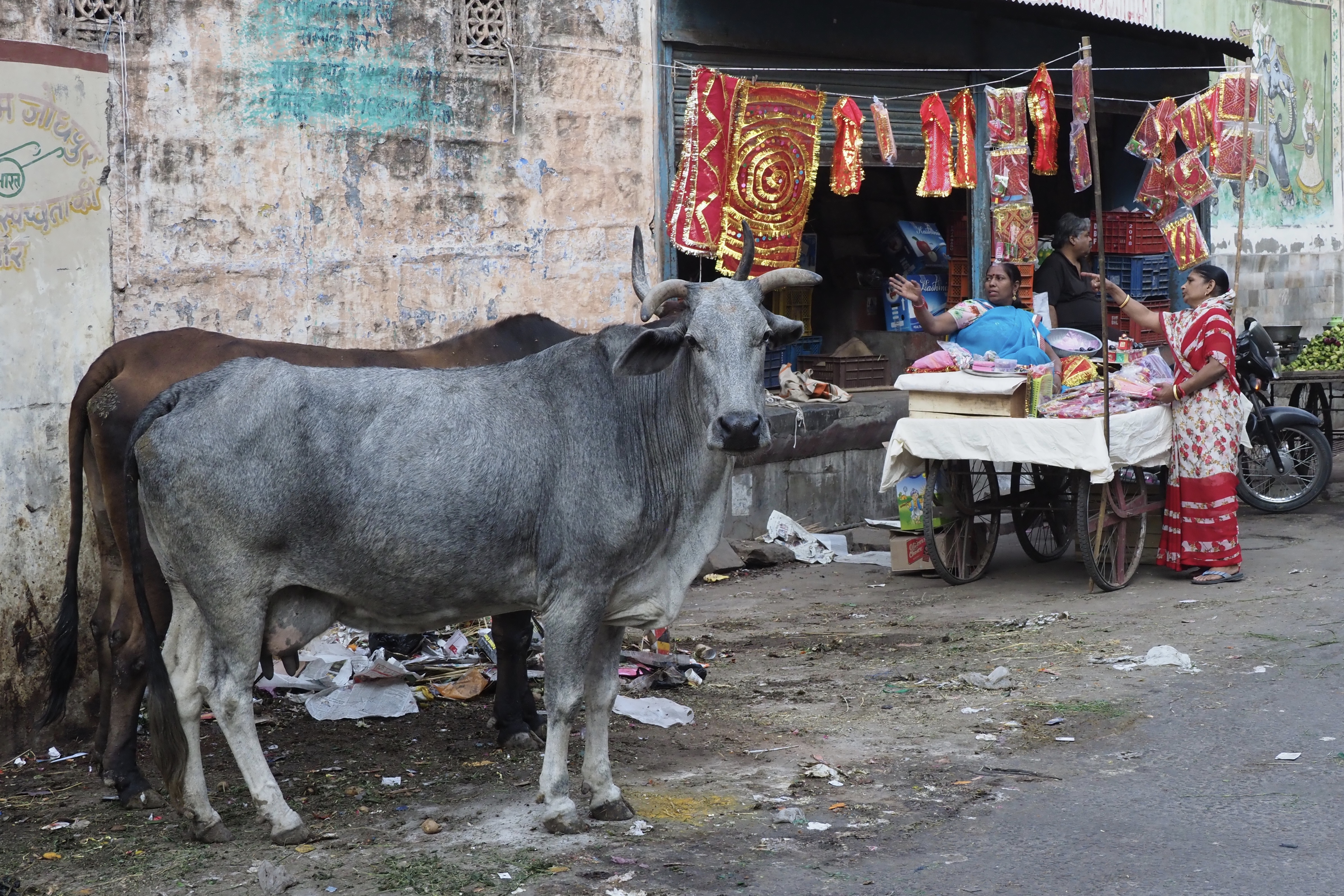 Then off to tangled narrow streets and local market—a jumble of sellers, street sweeper, children going to school, housewives chatting, elderly enjoying their tea and the many cows. We were warned to stay clear of the cows because they could be aggressive. I gave them generous right of way as I captured their presence.