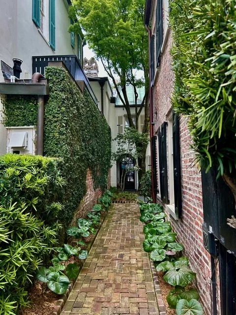 We were enthralled with the experience, and 27 years later returned on our roadtrip back to Michigan from Florida. Our schedule produced another disappointment. We had missed the tour by two days. However, we made “lemonade” out of that lemon, by booking a brand new tour by Bulldog Tours. In fact we were the first group on a walking tour called “South of Broad Houses and Gardens”. For me, it was more of a “Secret Gardens of Charleston” tour, because I often trailed behind the group, snapping photos through stunning 18th and 19th century wrought iron gates to capture the beautifully landscaped gardens inside.